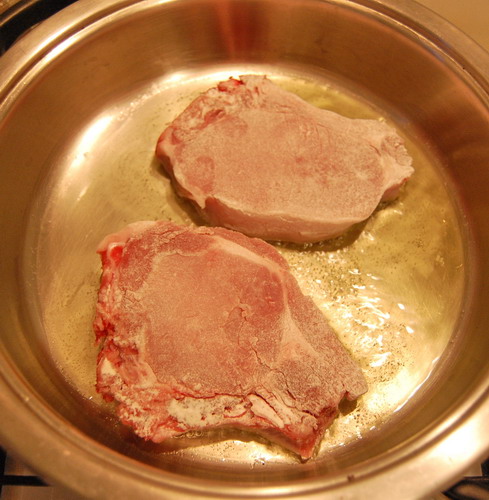 Pe partea culinara s-a executat una bucata reteta italieneasca (provenienta Marcella Hazan, pentru cunoscatori) care se numeste sugestiv si foarte ademenitor pentru un winegeek: “Braised Pork Chops with Two Wines”. Procesul tehnologic a decurs astfel: